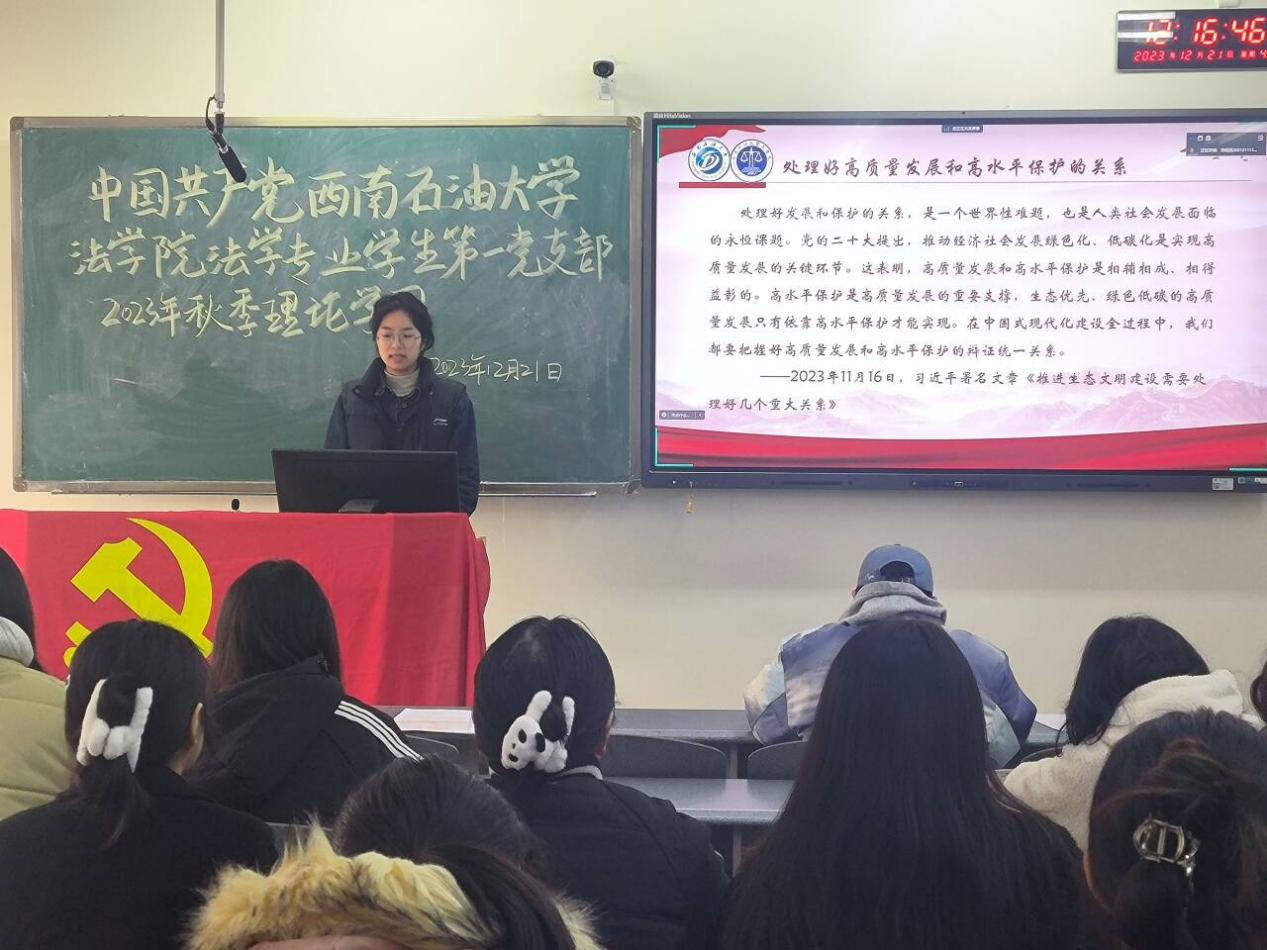 旨在深入学习贯彻习近平生态文明思想,提高党员同志对于推进生态文明建设中的几个重大关系的认识能力,法学院法学专业学生第一党支部于12月21日12时在博学楼B306召开十二月第二次理论学习。本次会议由党支部见习支委刘妞妞同志主持,党支部全体同志积极参与。