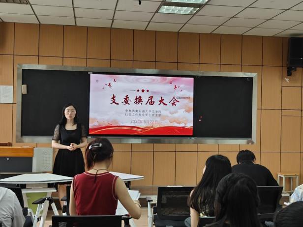 在支委换届大会上,主持人分别介绍王一闵、余海洋等四位见习支委工作表现,经支部大会讨论,具有表决权的十七名正式党员无记名投票,主持人宣布王一闵、余海洋两位同志正式成为新一届党支部委员会委员。