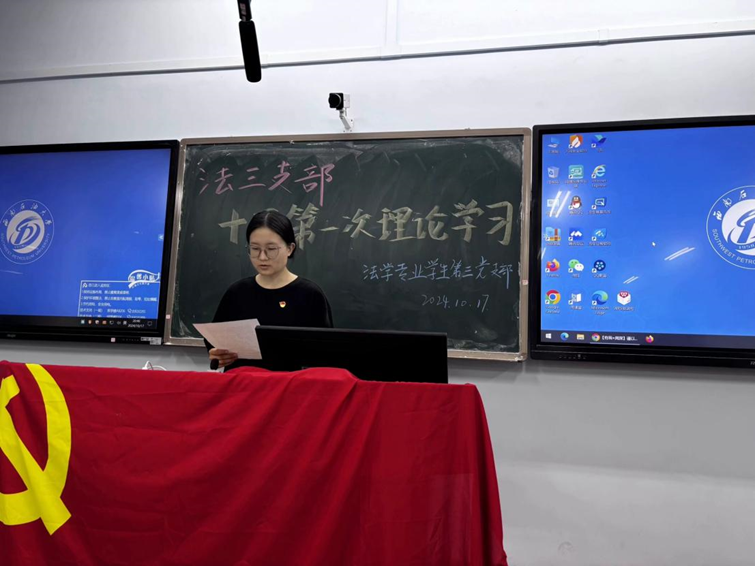 为深入学习贯彻党的二十届三中全会精神,深刻理解全会在“构建支持全面创新体制机制”部分对深化教育综合改革作出的重大决策部署,2024年10月17日,法学专业学生第三党支部于博学楼A203教室开展了十月第一次理论学习。本次学习主题为深化教育综合改革理论,围绕《深化教育综合改革为加快建设教育强国提供强大动力》《着力培养担当民族复兴大任的时代新人》两篇文章展开。