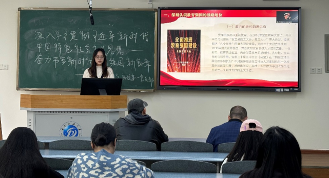 会议开始,由党支部第一党小组刁怡萍同志带领参会同志学习主要内容。教育是强国建设、民族复兴之基。刁怡萍同志从深刻认识教育强国的战略地位、深刻把握教育强国的科学内涵和全面深入落实教育强国建设的战略任务三个方面进行系统阐述,在层层递进的细致讲授中,不断地和参会同志产生共鸣并引起大家对教育强国思想的深入思考。
