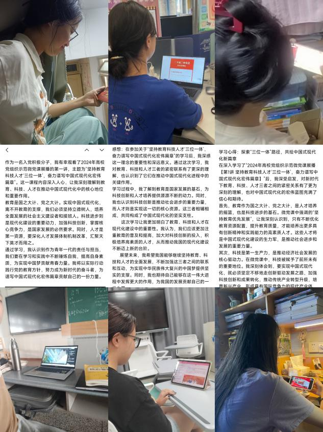 本次线上微党课学习以《坚持教育科技人才“三位一体”,奋力谱写中国是现代化宏伟篇章》为主题,主持人以领学的方式带领学生党员集中学习相关内容。党对构建支持全面创新体制机制作出的重要部署,明确提出“统筹推进教育科技人才体制机制一体改革”。以此为指引,加快完善科教协同育人机制,培养造就一支规模宏大、结构合理、素质优良的创新型人才队伍。同时,党课还展示了我国在教育事业、科技创新及人才培养方面所取得的辉煌成就,为我们新时代青年树立了优秀榜样,也指明了前进的方向。