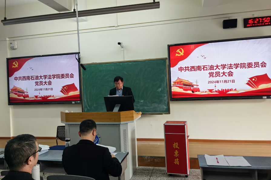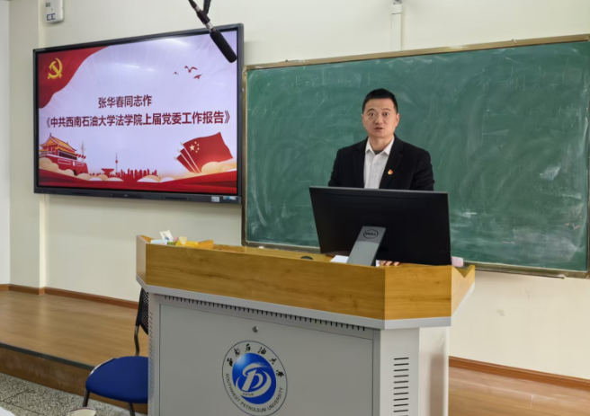 11月21日,中共西南石油大学法学院党员大会在博学楼A502举办。大会由法学院党委副书记、纪委书记于百江主持,法学院党委书记张华春代表上届党委作工作报告,会议选举产生了法学院党委委员会和纪律检查委员会。