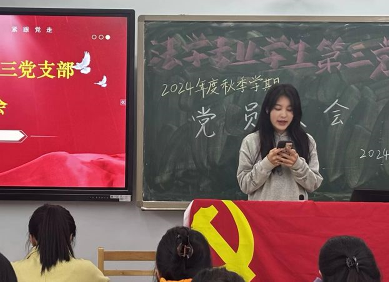 2024年11月15日晚,法学专业学生第三党支部在思学楼C205举行了预备党员转正大会。此次大会旨在对预备党员进行考察,讨论其转正申请,并进一步推动党支部的发展。