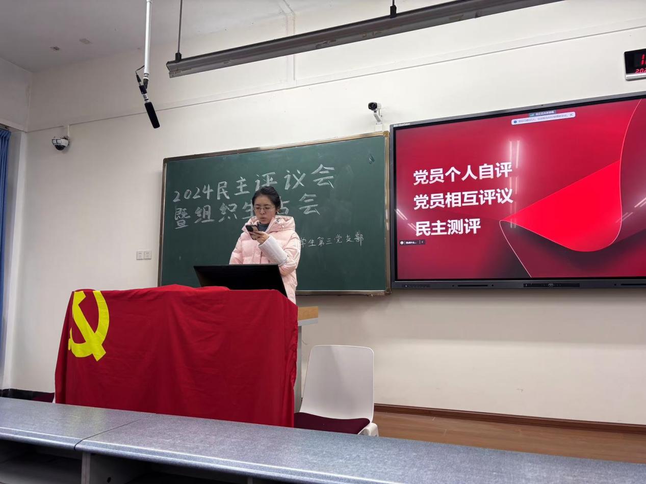 为深入学习贯彻习近平新时代中国特色社会主义思想,进一步加强党员教育管理,提升党组织的凝聚力和战斗力,法学专业学生第三党支部于 2024 年 12 月 26 日下午 16:30 在博学楼召开了民主评议会暨组织生活会。本次会议由支部书记 邵梧枭主持,支部全体党员参加。