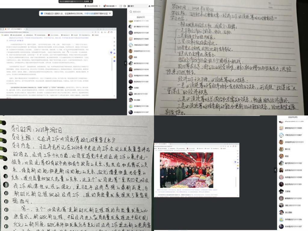 2025年3月5日晚20:30,法学专业学生第三党支部通过腾讯会议组织开展2025年三月第一次理论学习活动,深入研读习近平总书记重要文章《经济工作必须统筹好几对重要关系》。支部全体党员围绕“新质生产力培育”、“有效市场与有为政府协同”等核心议题展开深入研讨,结合专业特色探索法治思维在经济治理中的实践路径。