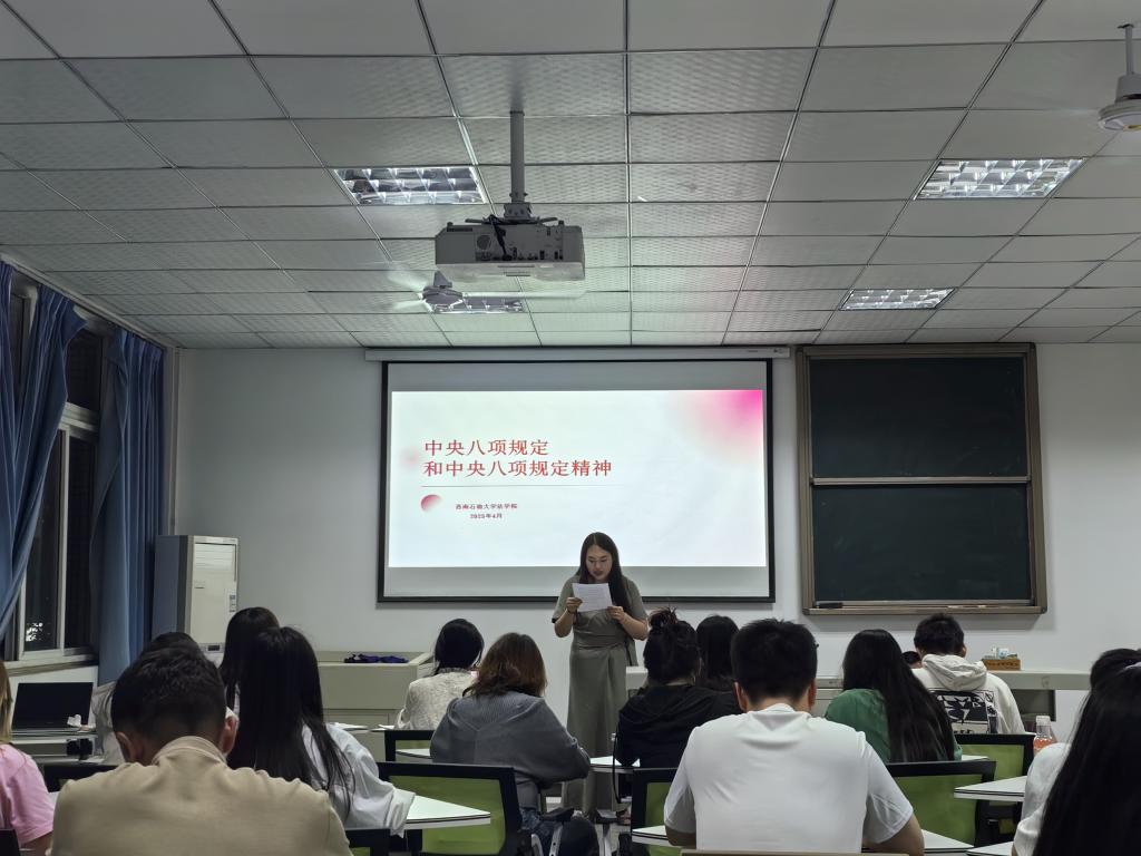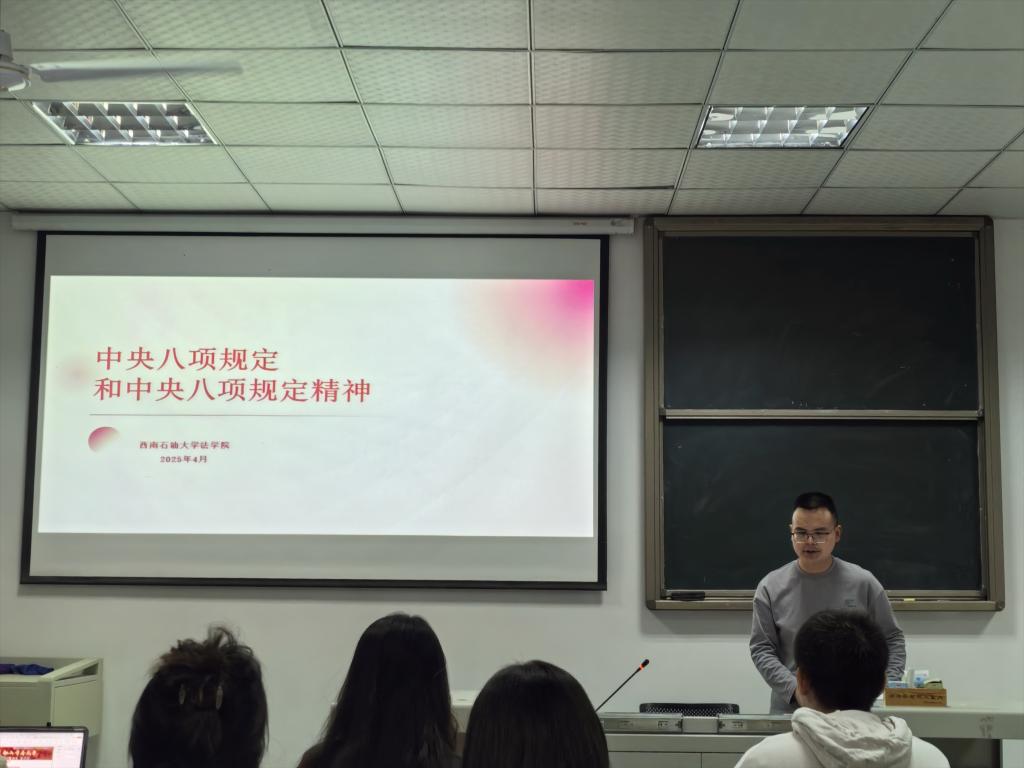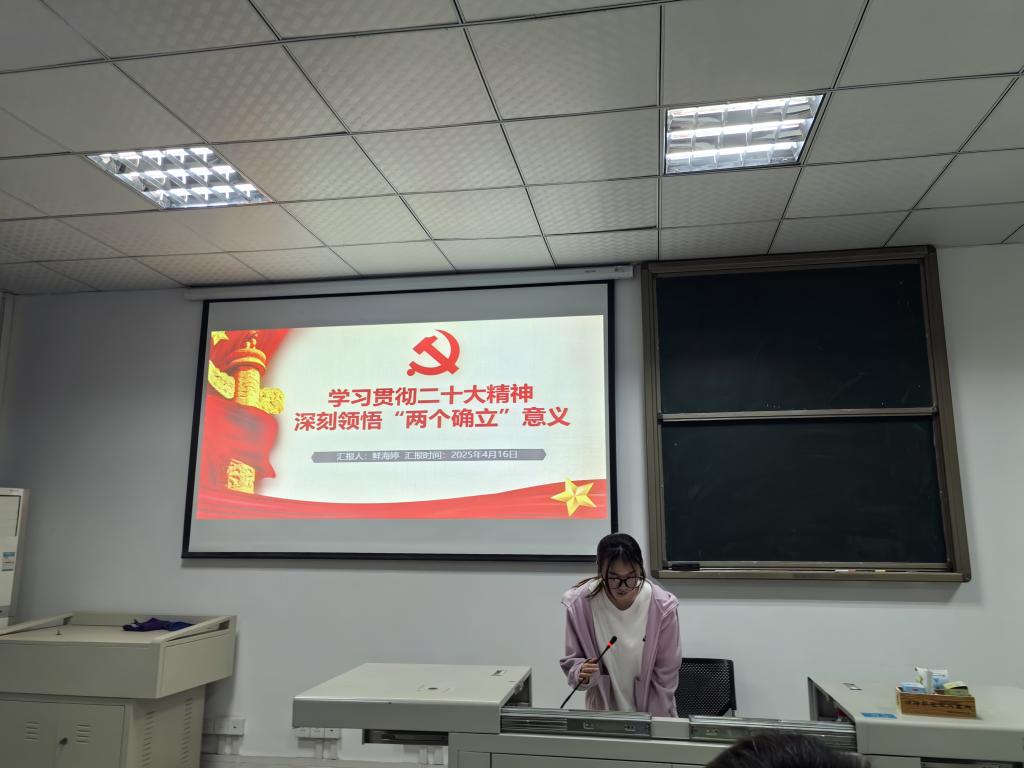 会议第一项,发展对象培训班指导老师邵梧枭以中央八项规定为主题,深入贯彻中央八项规定精神学习教育。他强调,青年学子肩负着维护社会公平正义的重任,更应率先垂范,以中央八项规定精神为准则,筑牢拒腐防变的思想防线。接着,法学专业学生第三党支部成员鲜海婷领学“两个确立”理论。从历史逻辑、理论逻辑和实践逻辑三个维度,详细解读“两个确立”的科学内涵。她鼓励大家,要将“两个确立”的理论自觉转化为坚定拥护“两个维护”的行动自觉。