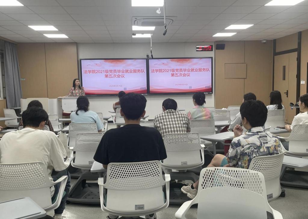 5月16日下午15:00,法学院2021级党员毕业就业服务队第五次会议于博学楼B105教室举行。会议由法学院2021级辅导员邓超越老师主持,2021级党员服务队全体成员参会。