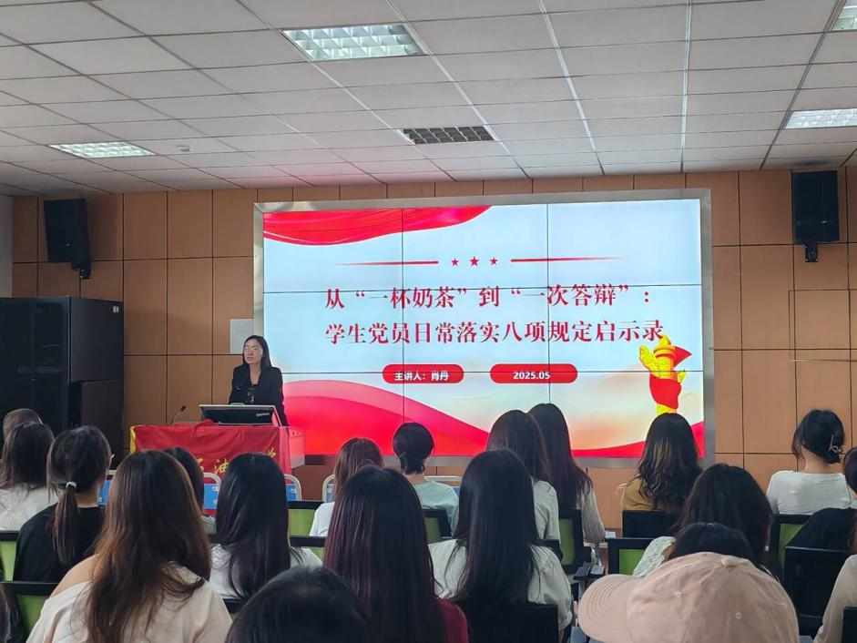 2025年5月15日,“从‘一杯奶茶’到‘一次答辩’:学生党员日常落实八项规定启示录”主题党课在博学楼A402举行。本次党课由社会工作学生党支部书记肖丹主讲,旨在引导学生党员深刻领悟中央八项规定精神,强化廉洁自律意识,为校园作风建设筑牢坚实防线。