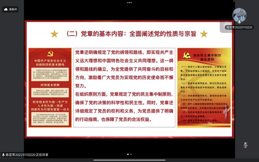学习中,陈亚萍同志结合专题课件,带领大家系统学习党章:回顾其历史沿革,从党的二大首部党章、七大党章确立毛泽东思想指导地位,到改革开放后党章多次修订适应时代发展;阐释核心要义,明确马克思主义为指导思想、辩证唯物主义和历史唯物主义为理论基石、全心全意为人民服务为根本宗旨;强调实践要求,号召党员坚定理想信念、遵守党的纪律、勇于担当作为。