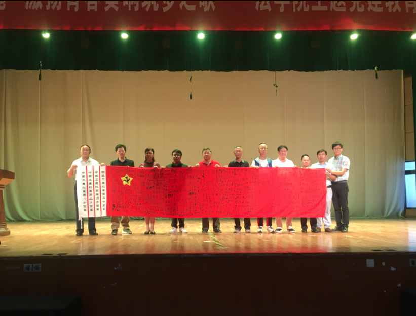 仪式上,一面签有原中央顾问委员会常务委员萧克上将、中央政治局原委员宋任穷上将、中央军委原副秘书长洪学智上将、中央军委原副主席张震上将等349名老红军、老将军名字的工农红军旗帜出现在现场。青年学生从革命后人的手里接过这面旗帜,也扛起了中华民族伟大复兴的历史使命。