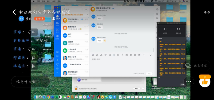 活动伊始,黄靖学长主要围绕职业规划和面试技巧两个方面的内容来跟同学们分享经验。学长首先通过自身的求职经历引出做好职业规划的重要性,他说基于兴趣并可以满足自身物质需求的职业规划才是最好的的规划。学长细致地讲解了如何确立长短期目标、分清主次矛盾、适时调整规划等方面的内容。与此同时,他也激励学弟学妹们敢于试错,鼓励其坚定信心,在逐梦的道路上不断奋发图强。在面试技巧方面,黄靖学长分享了简历制作、面试机会的创造与把握、面试不同环节的注意事项等方面的内容。为了让学弟学妹们更加清楚地了解面试的要点,学长还现身说法,用自己和朋友的实例跟同学们诠释了面试中应该如何表现,并传授给大家成功的面试诀窍在于“落落大方,礼仪适当”。最后,学长与学弟学妹们进行了线上的答疑互动,他激励同学们通过当前众多双向选择交流的平台,不断拓宽求职渠道,保持良好的心态,争取早日如愿就职。