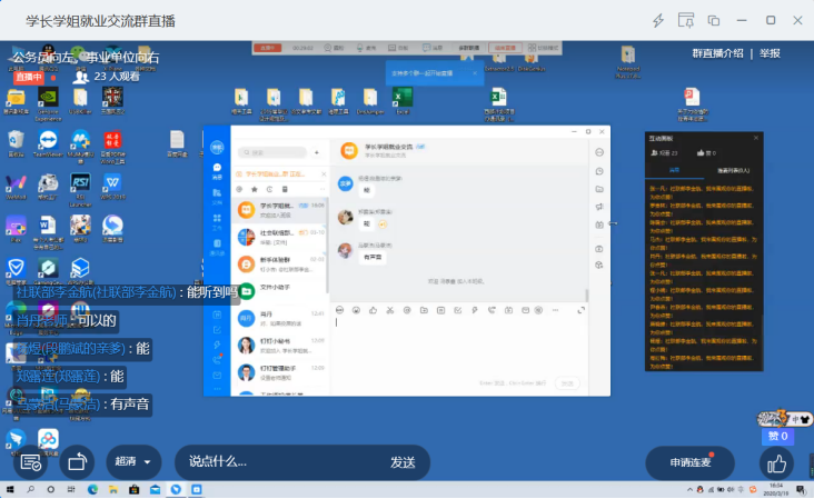 李金航学长首先以当前公考的形势开场,结合自身公考经历给我院2020届毕业生带来了许多干货。李金航学长特别强调应考中有舍才有得,刷题时要有侧重,对自己不擅长或无法短期提分的模块可以暂且放弃。同时,学长也特别提到申论板块需要学弟学妹们精雕细琢、惜字如金。为了让学弟学妹们更加了解公务员的工作内容和性质,李金航学长也分享了自己工作后的感受和体验,告诉大家做基层工作必须要有耐心,并激励大家向更高的平台冲刺。学长除了分享公考经验外,也给同学们介绍了西部计划、大学生村官等其他的基层就业项目,鼓励大家去基层服务锻炼,积累实践经验。活动尾声,2020届毕业生们也向学长提出了自己的求职困惑,学长都耐心地一一解答,为毕业生们指点迷津。