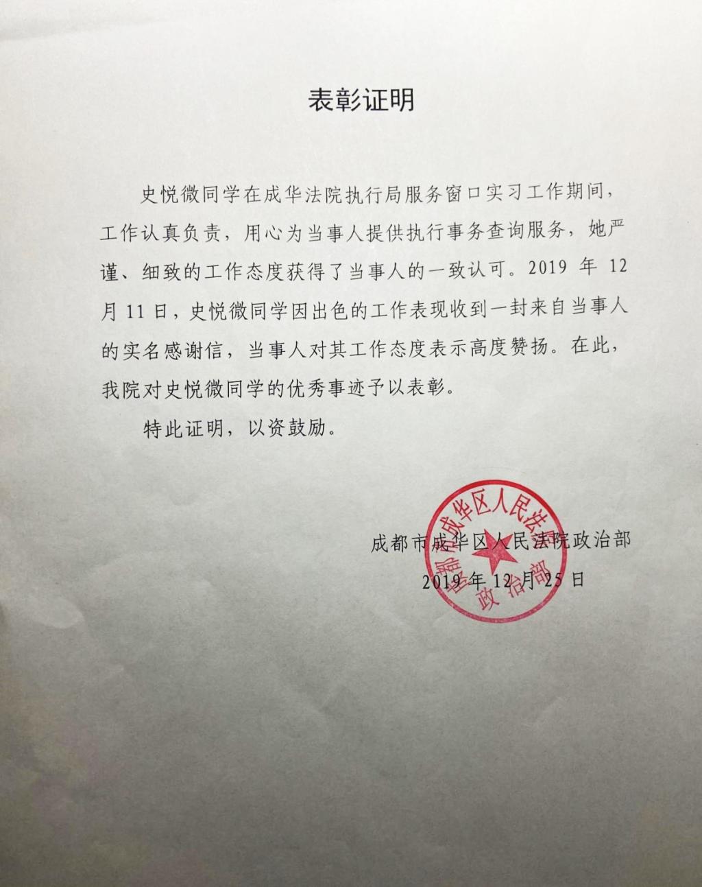 2019年12月11日,成都市成华区人民法院收到了一封来自当事人的实名感谢信,信中写到:“我要表扬4号执行事务的史同志工作很认真、很细致,服务态度非常好,我要向她致敬!”信中的这位“史同志”正是我院法学专业2017级学生史悦微。