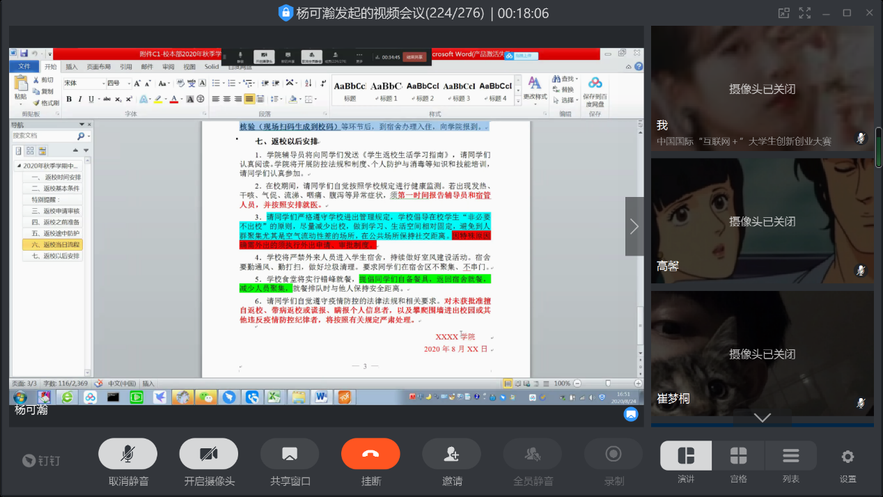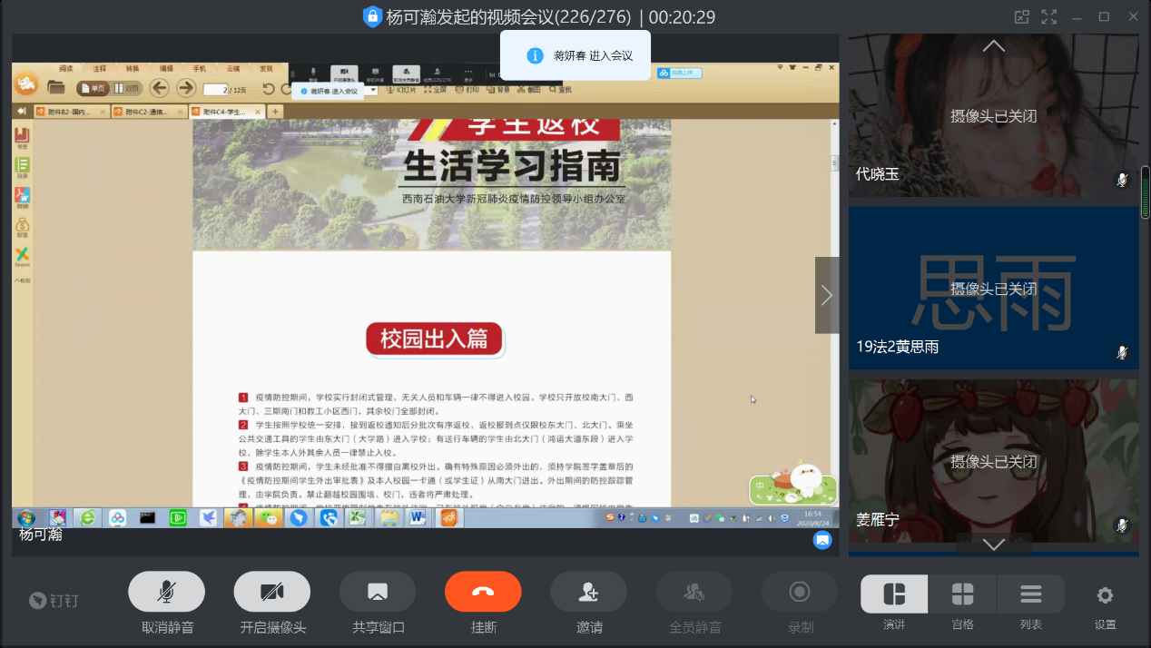 会议伊始,杨老师首先介绍的是返校报到须知,分为六个部分。在第一部分向同学们展示出法学院关于学生返校报到安排的须知,将返校时间和批次内容设置了醒目的颜色,并将返校时间的严格要求告知同学们,强调不得提前返校。第二部分介绍了返校的基本条件,包括健康状况、接触史、旅居史、健康码等,强调了健康状况证明和安排行程务必在低风险区域的相关要求,确保同学们能健康、平安返校。第三部分介绍了学院的返校申请审核安排,包括申请流程、申请时间和上传截图的注意事项。第四部分介绍了返校前必要的准备,包括需准备的物资、需准备的行程安排等,特别强调了健康系统的打卡,并督促同学们每日及时准确地填报健康登记系统。第五部分强调了返校当日的流程,以及校门开放时间的安排,并用醒目的颜色标记出同学们需要提前用文件袋整理好的返校证件、材料。
