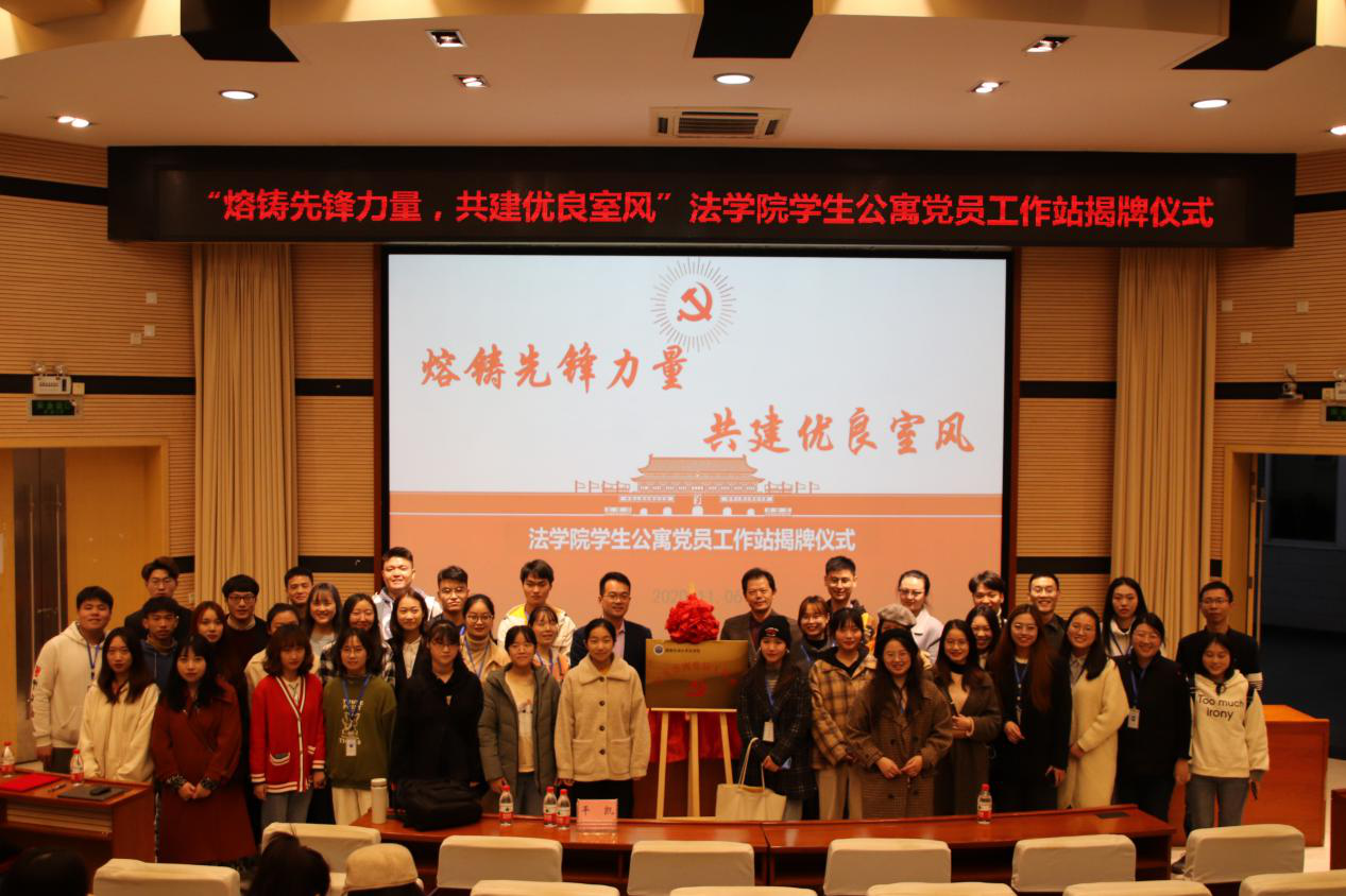 为了进一步贯彻习近平新时代中国特色社会主义思想和党的十九大精神,落实全国高校思政会议部署,不断加强我校基层党建工作力量,不断推动党员管理和学生公寓党建服务规范化,精细化,信息化。根据校党委有关工作要求,借鉴其他高校党建中心、党员工作站的建设经验,结合我院实际,法学院党委决定,正式挂牌“法学院学生公寓党员工作站”并在11月5日晚19点在思学楼A114举行揭牌仪式。