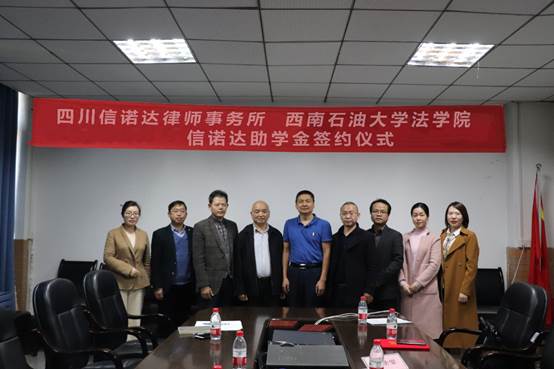 为促进教育与实践相结合,加强校企沟通合作,11月18日下午,西南石油大学法学院与四川信诺达律师事务所信诺达助学金签约仪式在博学楼会议室AB510顺利举行。四川信诺达律师事务所主任陈飞、高级合伙人兼党支部副书记林贞祥、高级合伙人张洪飞和专职律师刘佳、行政部长范红艳,法学院党委书记兰力平、院长卫德佳、副院长傅晶晶出席本次签约仪式。此次签约仪式由我院党委副书记于百江主持。