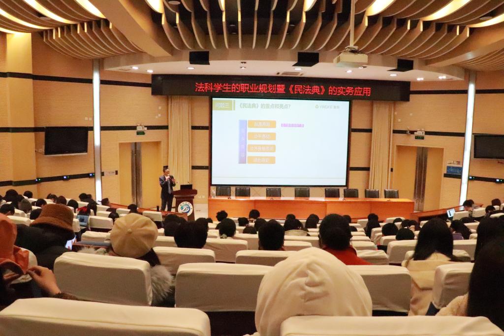 2020年12月2日晚19点,我院组织开展的“法科学生的职业规划暨《民法典》的实务应用”讲座在思学楼A114顺利进行。本次讲座由法学院团委副书记邓超越主持,特别邀请到了来自盈科律师事务所的陈丰律师为同学们讲解相关内容,法学院各年级同学积极参与,现场座无虚席。