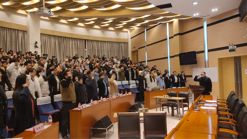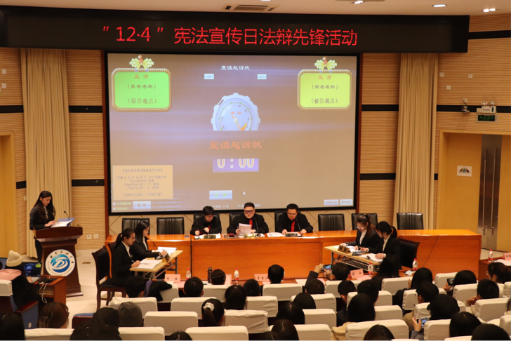 本次活动以学习宣传宪法为活动核心,共有宪法宣誓、院长致辞、模拟法庭表演赛、合议庭点评以及法学院辩论队授徽仪式五个环节。在由田维老师领誓的宣誓环节中,全体师生声音洪亮、语气笃定,坚定的目光彰显着捍卫宪法庄严的勇气,洪亮的宣誓声饱含着献身法治建设的决心。在院长致辞环节中,法学院副院长傅晶晶老师强调崇尚宪法、遵纪守法是每个公民应尽的社会责任,并希望每一位法学学子都让宪法精神植根心底,并将其化为尊法守法的行动自觉。