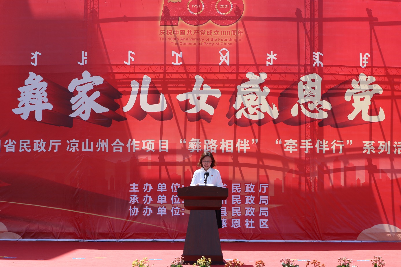 6月28日,四川省民政厅、凉山州合作项目“彝路相伴”“牵手伴行”系列活动——“彝家儿女感恩党”,在凉山州越西县感恩社区举行。四川省民政厅胡建林副厅长、杨伯明巡视员,凉山州副州长李华、州委组织部长刘晓博等领导出席活动,我校法学院副院长谭祖雪教授作为厅州校社四方联动方6所高校的代表,应邀出席活动并代表高校发言。
