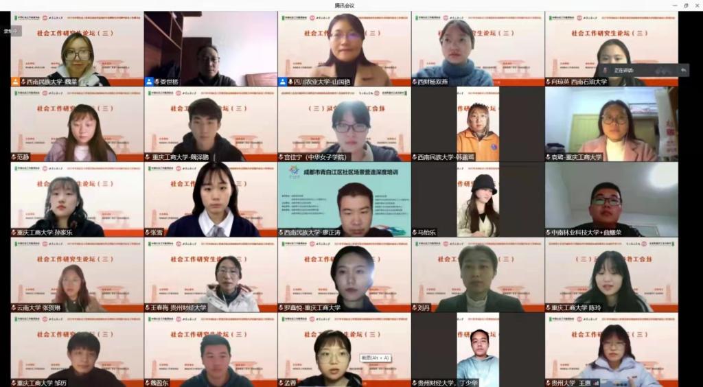 在会议上,来自四川、重庆、云南、贵州等西南地区省市以及江苏、广西等地高校的专家学者就当前社会工作研究热点问题进行了主旨发言。会议共设有七个分论坛,分别为:彝路相伴:移民社会工作理论与实践、一流建设:社会工作专业高质量发展、服务铸牢中华民族共同体意识与西部乡村振兴实践、乡村振兴社会工作实务以及三个社会工作研究生论坛,对社会工作的不同领域展开深度研讨。我院2020级社会工作专业研究生刘慧芝同学从可行能力视角出发对城市贫困问题进行分析与解读,探索我国城市贫困新的治理理念与方式;向琼英同学探讨ABC-X理论模型下介入研究失独妇女的情绪抗逆力,提出激发案主自身的抗逆力去应对情绪压力的社会工作介入策略。会议最后,评议老师对两位同学的论文进行充分肯定与积极回应,同时也提出研究还可待改善的问题,促使论文研究更加完善。