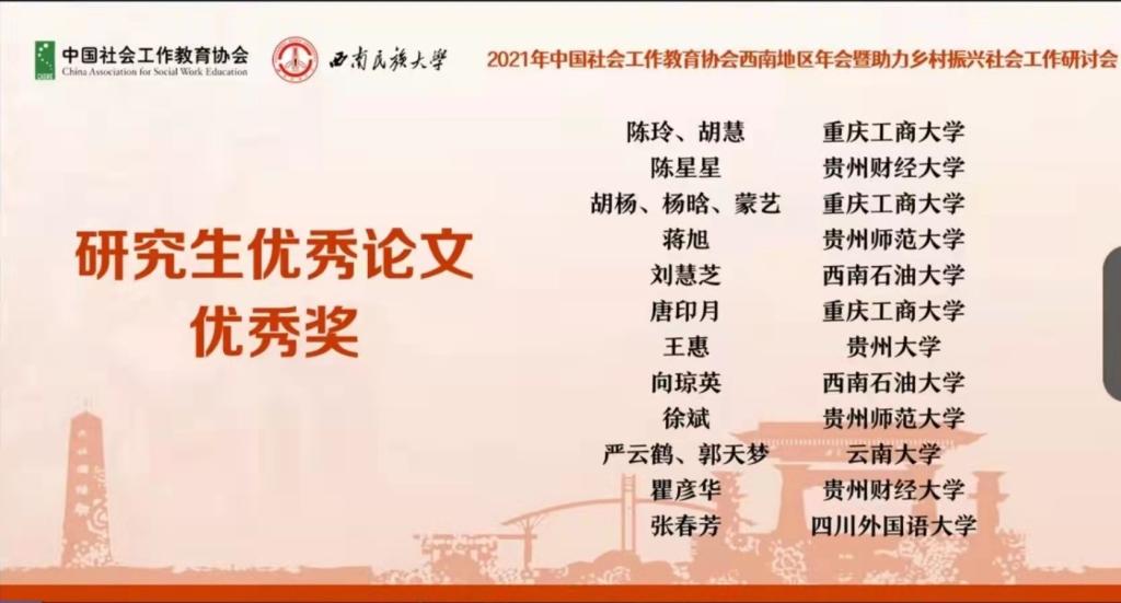 2021年中国社会工作教育协会西南地区年会于11月13日在成都召开,因疫情原因会议改为线上进行。西南石油大学法学院社会工作硕士专业研究生刘慧芝、向琼英、夏怡、刘一辉4位同学的论文入选研究生论坛并做论文分享。经过组委会专家的匿名评审,2020级研究生刘慧芝同学的论文《困境与转变:基于可行能力理论下的城市贫困治理》、向琼英同学的论文《因灾失独妇女情绪抗逆力的社会工作策略研究-基于ABC-X理论模型》荣获社会工作研究生论坛优秀论文奖。