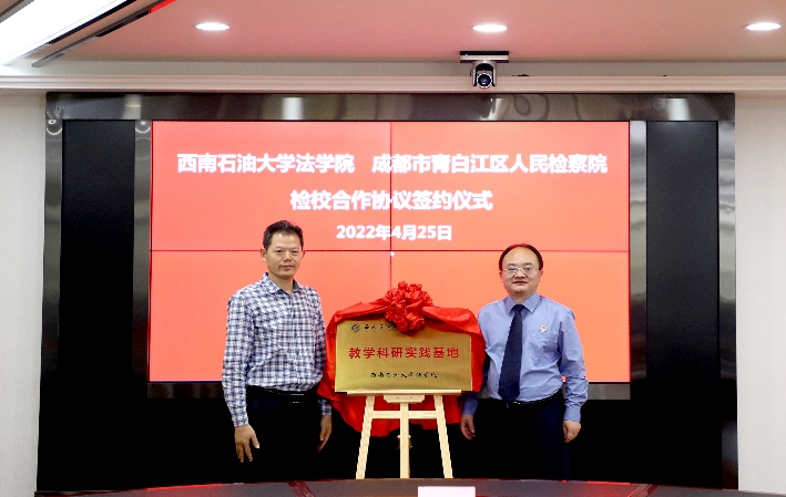 2022年4月25日,在青白江区人民检察院四楼会议室举办了“成都市青白江区人民检察院与西南石油大学法学院检校合作协议签约仪式”,法学院党委书记兰力平、院长卫德佳、院长助理王浩应邀参会。