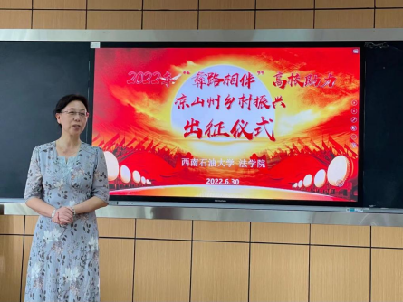 2022年6月30日中午,西南石油大学法学院2022年“彝路相伴”高校助力凉山州乡村振兴出征仪式在博学楼A406教室举行。法学院副院长谭祖雪、实习带队老师鲁航、张江龙出席会议,社会工作硕士2021级全体赴凉山州实习学生参加了会议。