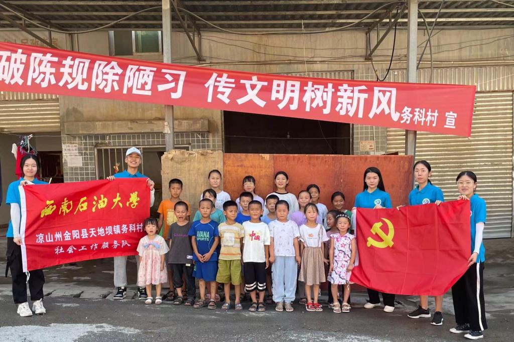 随着脱贫攻坚的全面胜利,凉山州经济社会发展取得前所未有的成就。但高额彩礼、铺张浪费、薄养厚葬等陈规陋习依然存在,一定程度上阻碍和制约了当地巩固拓展脱贫攻坚成果与乡村振兴有效衔接工作的开展。为深化移风易俗工作的纵深开展,倡导和培育社会文明新风尚,7月至8月间,法学院选派5名社会工作专业研究生入驻金阳县天地坝镇务科村,在专业教师的指导下开展以“乡村治理、移风易俗”为主题的为期两个月的专业社工服务活动,助推该村乡村治理水平再提升,同时结合专业服务撰写毕业论文,以实际行动响应习近平总书记“把论文写在中国大地上”的号召。凉山州金阳县融媒体中心以“西南石油大学:开展社工服务活动助力帮扶村振兴发展”为题对此进行了报道。