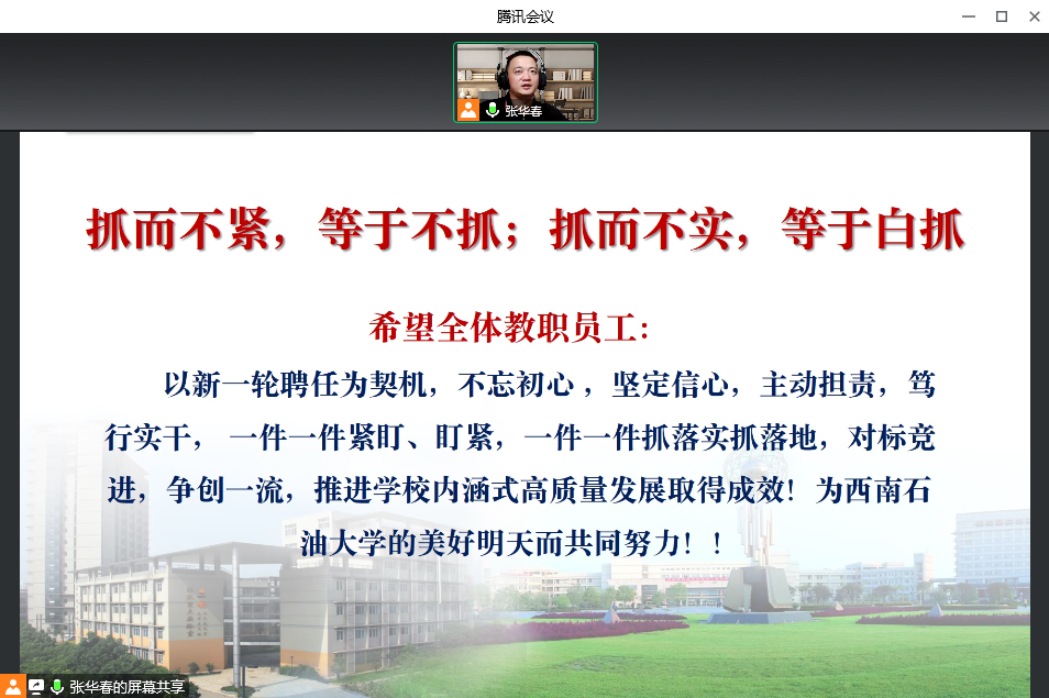 首先,张书记从2022年有关高等教育的重要政策文件及会议精神、上半年学校重点工作部署落实情况及本学期工作安排、新一轮教职工聘任工作三个方面传达了“西南石油大学2022年工作部署会”精神,并就学院官方媒体管理和国庆节放假安排进行了相关部署。