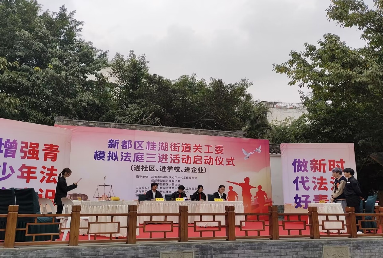 为推动法治志愿者行动规范化、社会化、常态化发展,增强高校与社会的联系,为基层法治化建设注入青年志愿者的蓬勃力量,我院同桂湖街道27个村(社区)联合开展了“护航青春”法治服务项目。2023年3月2日,法学院联合桂湖街道关工委在锦水苑广场组织开展了模拟法庭“三进”活动。新都区关工委执行主任麻渝生、常务副主任胡元义、常务副主任刘际宁等各位领导、新都区委政法委政治处主任李亮、新都区人民法院副院长张明锐、桂湖街道人大工委主任陈涛、党工委副书记、关工委主任杨道林、关工委执行主任徐南贵及领导班子成员、我院团委书记邓超越,成都市现代制造职业技术学校师生代表,还有相关律师事务所、社会企业负责人及各村、社区关工委执行主任参加上述活动。