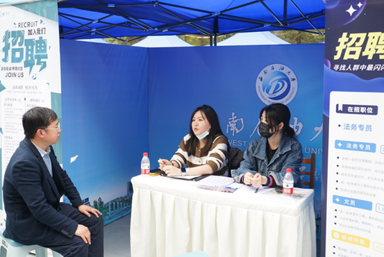 为拓宽就业渠道,提高就业质量,3月15日下午,法学院2023届毕业生专场招聘会在学校学生活动中心前广场举行。学校招生就业处副处长肖友平莅临现场进行指导,法学院党委副书记、纪委书记于百江,院团委书记、学生工作办公室主任邓超越,毕业班辅导员杨可瀚,2022级辅导员邵梧枭,兼职辅导员谢莹娇等到现场为求职学子加油鼓劲。