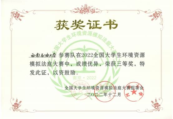 2023年3月26日,“2022年全国大学生环境资源模拟法庭大赛”奖项揭晓。法学院首次组队代表西南石油大学参加比赛,获全国三等奖,2020级本科生李蒙获“优秀选手奖”,创造了学院参加学科竞赛的新突破!