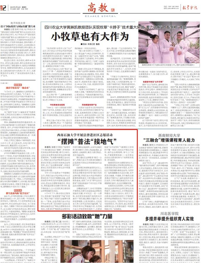 今年3月5日是第60个学雷锋纪念日,我院大学生志愿者在各个社区开展模拟法庭、法律咨询等多种形式的学雷锋志愿服务活动,把法治志愿服务规范化、常态化,帮助基层群众化解日常纠纷、提升维权能力,让小区居民真正感受到法律帮助随时在身边。我院青年法治志愿者任军蓉在成都市新都区金东社区“摆摊”,向居民发放普法宣传资料,送上“法治精神食粮”,其他志愿者解答居民日常生活中常遇到的法律问题。