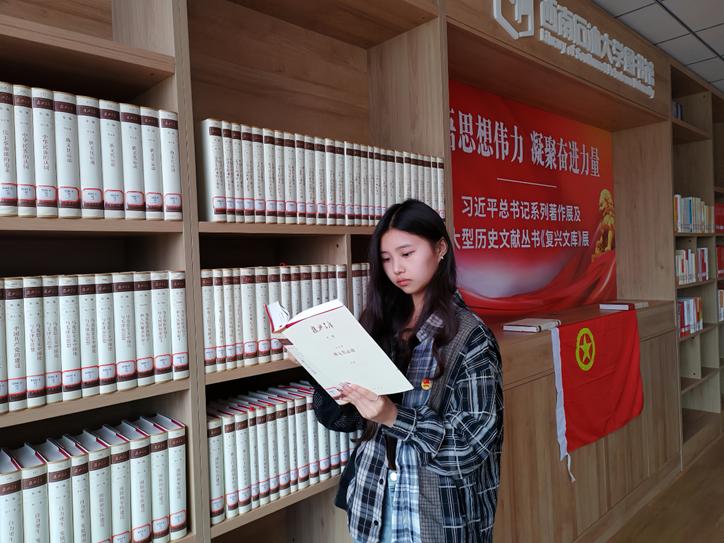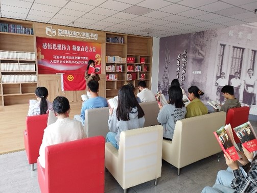 调研活动之外,与学校图书馆共办的“共读新时代新经典”活动也在五四青年节当天开启。协会将宣传海报及《习近平与大学生朋友们》《习近平的七年知青岁月》《中国共产党简史》等主题阅读书籍摆放在图书馆大厅,并提供线上阅读方法,线上线下结合,号召同学们用心读,用心学,用心悟。活动过程中采取了多种形式共读,包括主题读书班、诵读活动等。在主题读书班中,协会成员们各自分享阅读心得,深入交流。在诵读活动中,成员们朗读主题图书,增强了对新经典的理解,感受思想的力量。