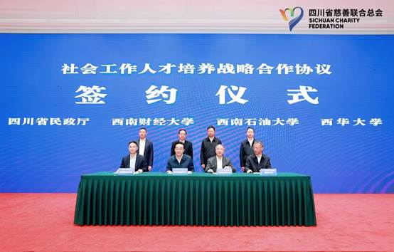 5月12日上午,在成都召开的“5–12”汶川特大地震15周年慈善感恩座谈会上,民政部原副部长、中华慈善总会会长宫蒲光,四川省人民政府副省长段毅君,四川省民政厅党组成员、副厅长廖永康,四川省民政厅党组成员、副厅长胡建林等领导,以及来自全国20个相关慈善支援省(市)民政厅(局)、慈善会(基金会)的代表,共同见证了四川省民政厅与西南财经大学、西南石油大学、西华大学四方战略合作协议签字仪式。四川省民政厅党组书记、厅长、四川省慈善联合总会会长益西达瓦,西南石油大学党委副书记、校长张烈辉等在协议书上签字。