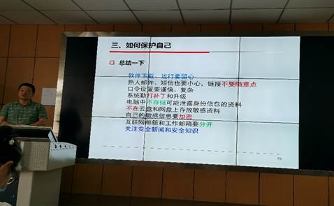 根据学校关于开展二级单位网络安全风险清理的通知要求和学校网络安全专题会议的要求,为保障学院网站的健康、稳定运行,避免发生危害网络安全事件,5月18下午法学院日下午召开全院教职工大会党委书记张华春同志向全体教职工讲了一堂精彩的网络安全教育课。
