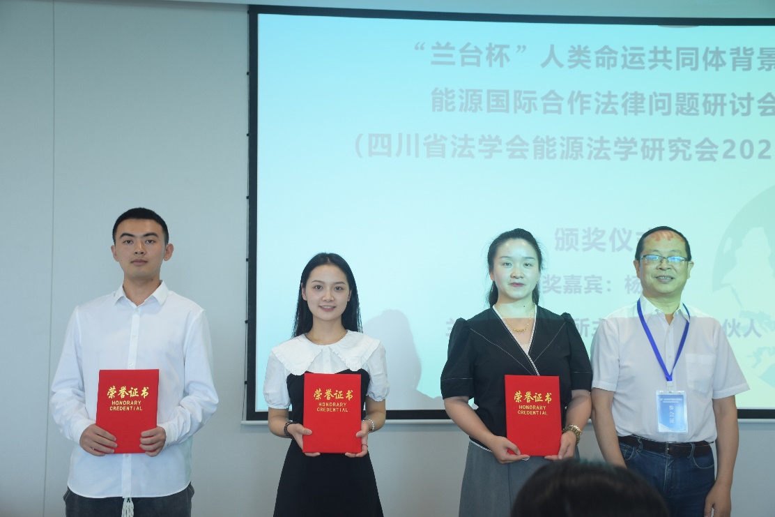 会议第五阶段议程是“兰台杯”人类命运共同体背景下能源国际合作法律问题研讨会优秀论文颁奖,由四川省法学会能源法学研究会副会长、西南石油大学石油天然气与工程学院副院长李勇明教授主持。本次研讨会共收到90篇文章,经专家评审,评选出一等奖6项、二等奖10项、三等奖14项、优秀奖17项。兰台律师事务所主任、高级合伙人杨少华律师宣读获奖名单。四川省法学会能源法学研究会副会长,成都高新技术产业开发区人民法院党组书记、院长何良彬,金堂县人民法院党组书记、院长徐文波,《人民法治》杂志社副主任、民建四川省委社法委副主任陈俊伶,四川联合环境交易所常务副总裁蒋洁萍女士向获奖论文作者代表颁发证书。