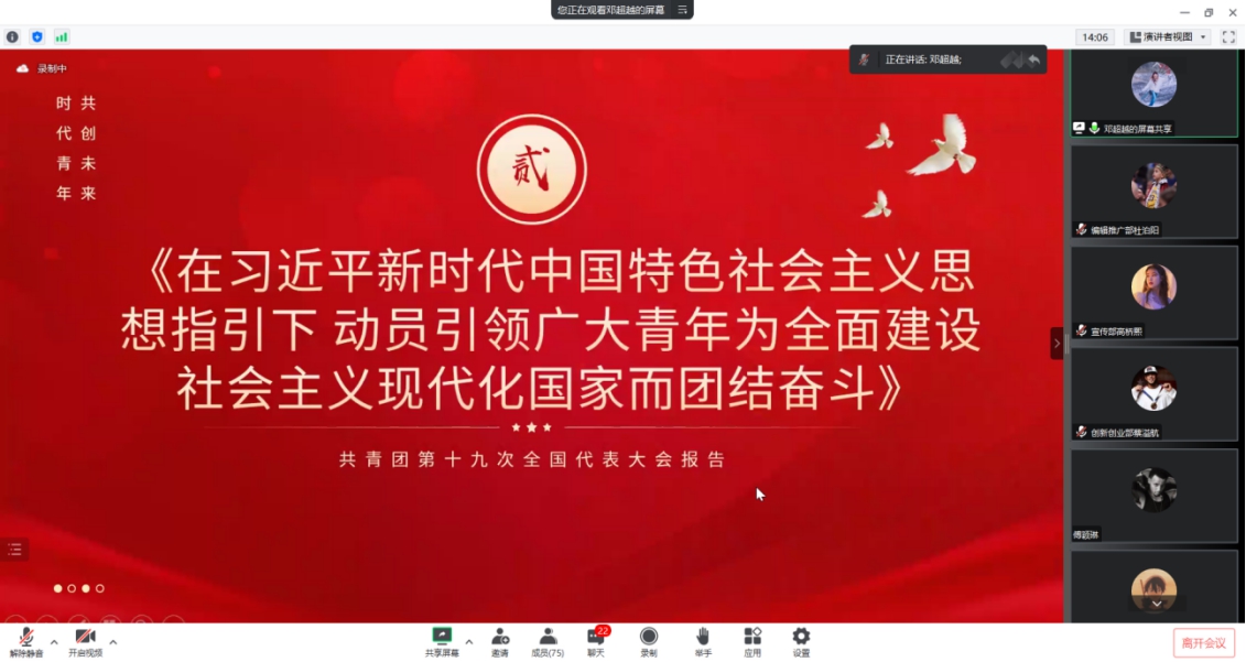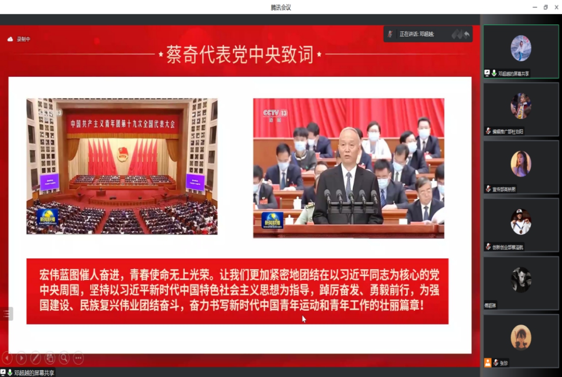 邓超越老师带领同学们学习了蔡奇同志代表党中央在中国共产主义青年团第十九次全国代表大会上作的题为《在强国建设民族复兴新征程上书写壮丽青春篇章》的致词、《中国共产主义青年团第十九次全国代表大会报告》、《中国共产主义青年团章程》和习近平总书记在同团中央新一届领导班子成员集体谈话时的重要讲话精神等材料。