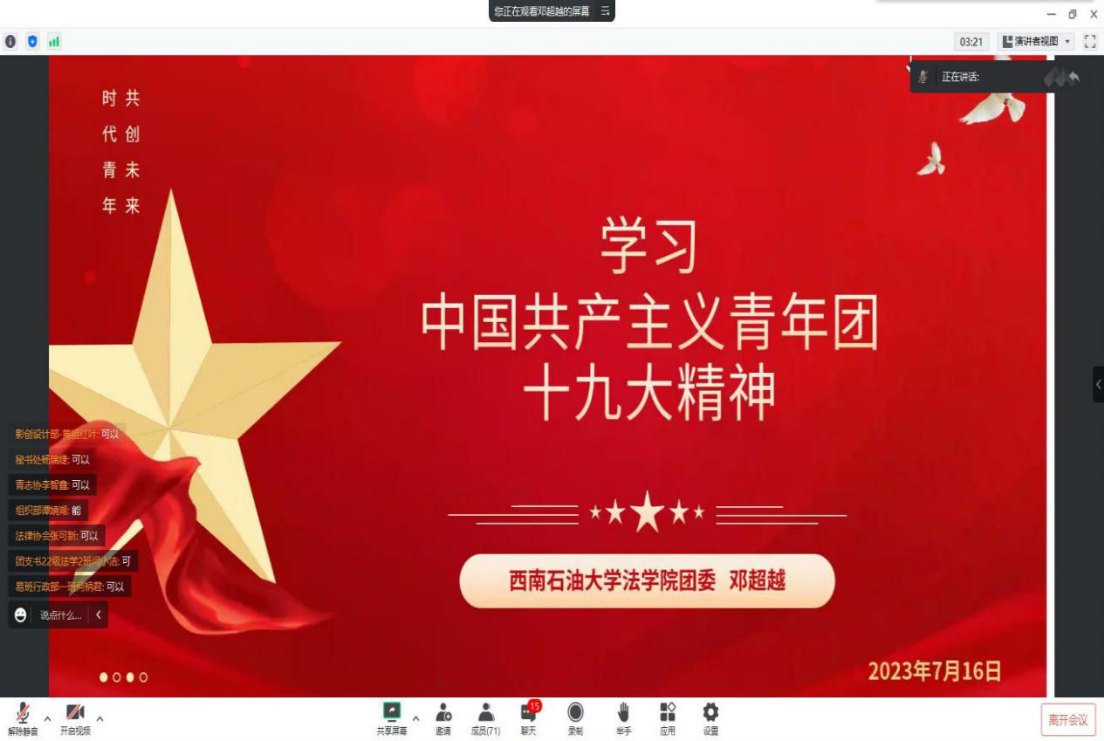 2023年7月16日下午,西南石油大学法学院团委顺利召开中国共产主义青年团第十九次全国代表大会精神专题学习讲座。本次学习讲座由西南石油大学法学院团委书记邓超越老师主讲,法学院团委、学生会、社团联合会各部长和各班级团支书等同学参加学习。