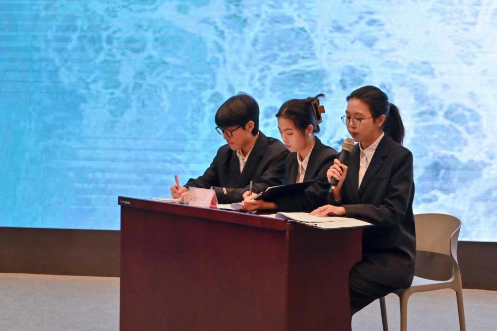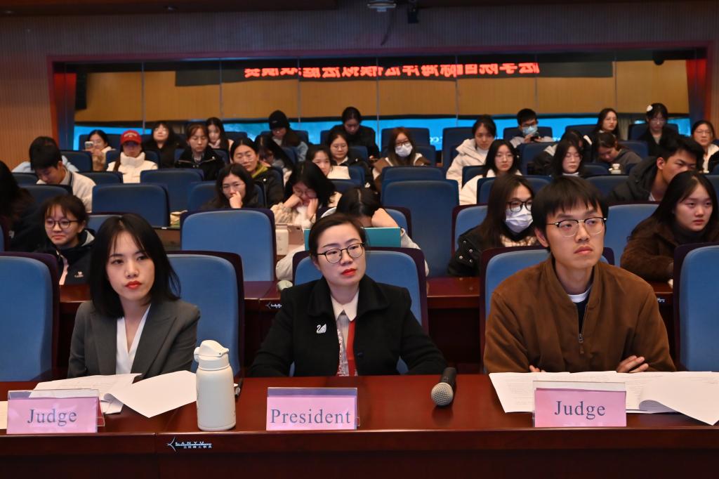 比赛特别邀请法学院院长傅晶晶教授担任主席法官,国际法教师李文怡博士以及法理学教师赵轩博士担任法官,通过更为专业的经验指导为比赛增益。同时,法学院党委副书记于百江、实训中心主任宋旭平、辅导员邵梧枭老师和谢莹娇老师也到现场观摩了比赛。参赛选手全程使用英文,就“气候变化及其对南温带海洋的影响”一案展开激烈的辩论,沉着准确地回复法官的提问,思维敏捷、言辞准确,展现出我院学生扎实的专业素养和出色的综合能力。对于各参赛选手的精彩表现,傅晶晶院长给出高度赞扬,并予以积极鼓励,激励我院学生加强理论学习、积极参与实践,以做出更优秀的成果展现。