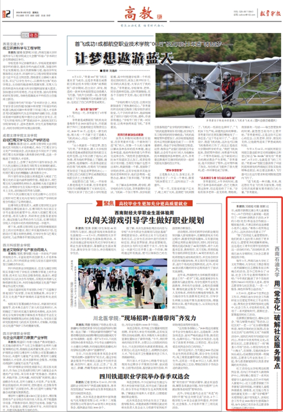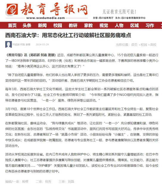 4月12日,《教育导报》刊发文章《西南石油大学:用“常态化”破解社区服务难点》,详细报道了我院开展“常态化”社工志愿服务的经验做法。