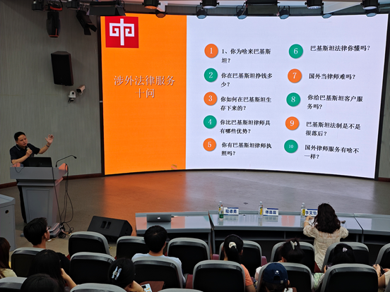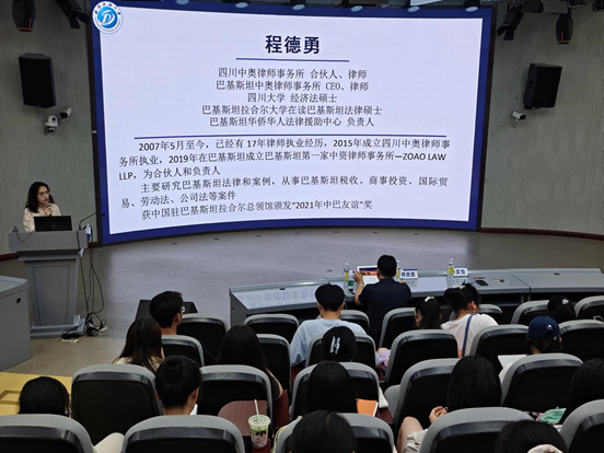 2024年6月19日14点,法学院于思学楼C110举行了涉外法律服务讲座,四川中奥律师事务所合伙人、巴基斯坦中奥律师事务所CEO程德勇主讲,法学院院长傅晶晶、专业教师李文怡和学生代表参加。