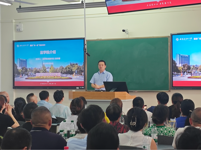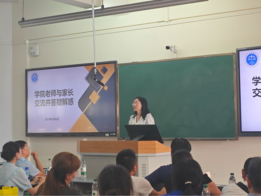 为促进家校共育,建立沟通桥梁,法学院于9月6日下午3点在博学楼B502举办了2024级新生家长座谈会,出席会议的有法学院党委书记张华春,法学院党委副书记、纪委书记于百江,2024级新生辅导员肖丹、杨梓因以及法学院新生家长200余人。