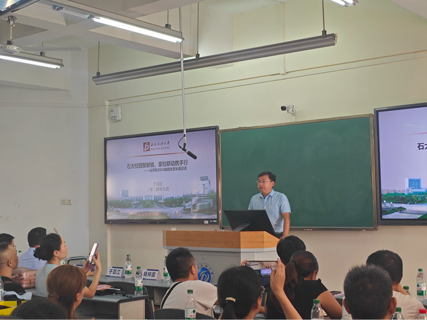 家长会上,张华春代表学院致辞并就法学院的历史沿革、师资力量、教学科研,学科优势等方面做了介绍,促进了家长对学院的了解。于百江以“石大校园聚新锐,家校联动携手行”为主题介绍了学生工作思路愿景以及教育管理情况。最后与会老师对家长们的咨询进行了逐一回应。