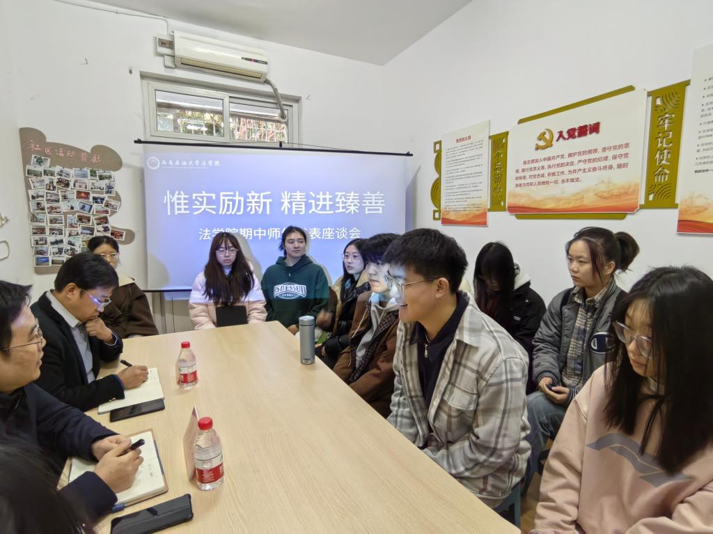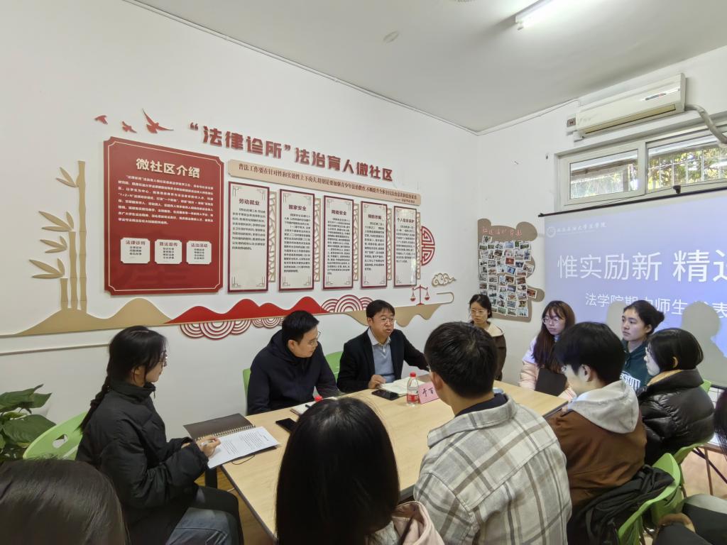 为进一步加强学院师生沟通,充分了解同学们在学业、生活等方面的需求与困惑,促进教学相长,增进凝聚力和归属感,法学院于2024年11月20日在弘毅居8栋学生“一站式社区”顺利召开了2023-2024学年秋季学期期中师生代表座谈会。出席本次会议的有法学院党委副书记、纪委书记于百江、法学院副院长周炎炎及来自各专业年级的学生代表们。