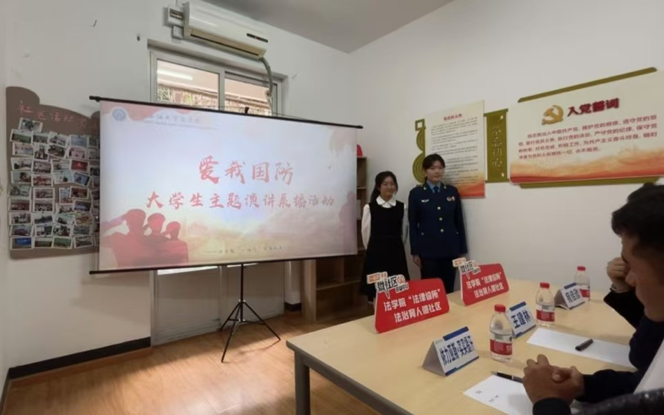 会前,与会人员到社区观摩了社区活动,“爱我国防” 大学生主题演讲展播活动在弘毅居 8 栋 125 室活力开讲。由国防教育科主任王建林老师、法学院院长助理宛佳欣老师、法学院本科生2022级退役军人依力亚斯·买买提汗同学担任活动嘉宾,学院同学在线观看参与。活动现场气氛庄重热烈,在线直播热度一路飙升,实时在线观看人数超 300 人,点赞量更是突破 7000 大关。法学院刘霖霏、高艺涵两位同学化身国防知识 “讲解员”,围绕国防主题展览、军事装备、英雄事迹娓娓道来,呈上一场震撼人心的国防教育盛宴,让同学们深切领悟到祖国强盛背后的艰辛,深知坚实国防是民族复兴的基石。此次活动不仅成功将国防教育融入社区日常,彰显了当代大学生的蓬勃朝气与爱国情怀,更为学校 “一站式” 学生社区迈向纵深发展注入强劲动力,助力育人环境持续优化升级。