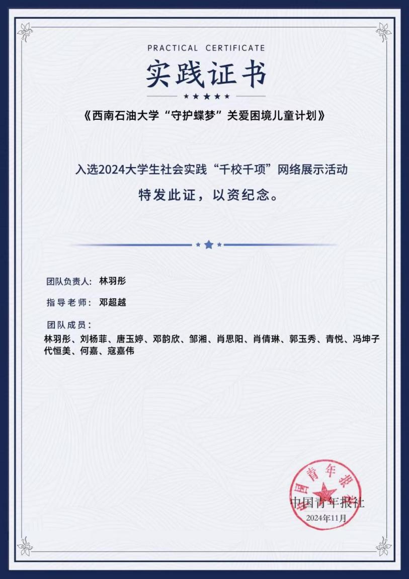 “西南石油大学‘守护蝶梦’关爱困境儿童计划”项目成员由西南石油大学朝阳社工协会成员组成,邓超越老师进行指导。2024年7月,实践团队奔赴内江市、成都市新都区开展困境儿童关爱活动,传承和弘扬志愿服务的崇高精神,并展现石大学子的深厚爱心与温暖关怀。实践队来到内江市未成年人救助保护中心,围绕“关爱、服务、赋能”三个维度,聚焦“资源链接、温情陪伴、实践宣传”三大方面,织密留守儿童保护网,构建寓教于乐、多元参与的服务圈。实践队赴新都区桥楼村,为该地回流儿童带来暖心服务,帮助回流儿童解决环境适应,学习压力等困难。队伍的志愿事迹受到中青网、全国大学生网、教育导报、内江日报等十余家媒体报道累计50余篇,形成调研报告数篇,为社会提供了宝贵的实践成果和经验分享。项目先后评获2024大学生社会实践“千校千项”网络展示活动、益行天府·第十二届“金拇指”大学生公益项目创新大赛三等奖、2024成都市家庭巾帼志愿者联盟项目创投优秀奖等荣誉。