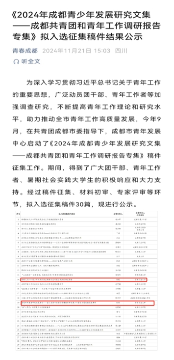 实践队伍收到多封表扬信,调研报告入选《2024成都青少年发展文集》两篇,1支队伍入选2024大学生社会实践“千校千项”网络展示活动。活动开展以来,我院学生暑期实践的优秀事迹获中国新闻网、教育导报网、中国青年网以及中国大学生网等各大媒体图文报道量累计356篇,其中主流媒体97篇。