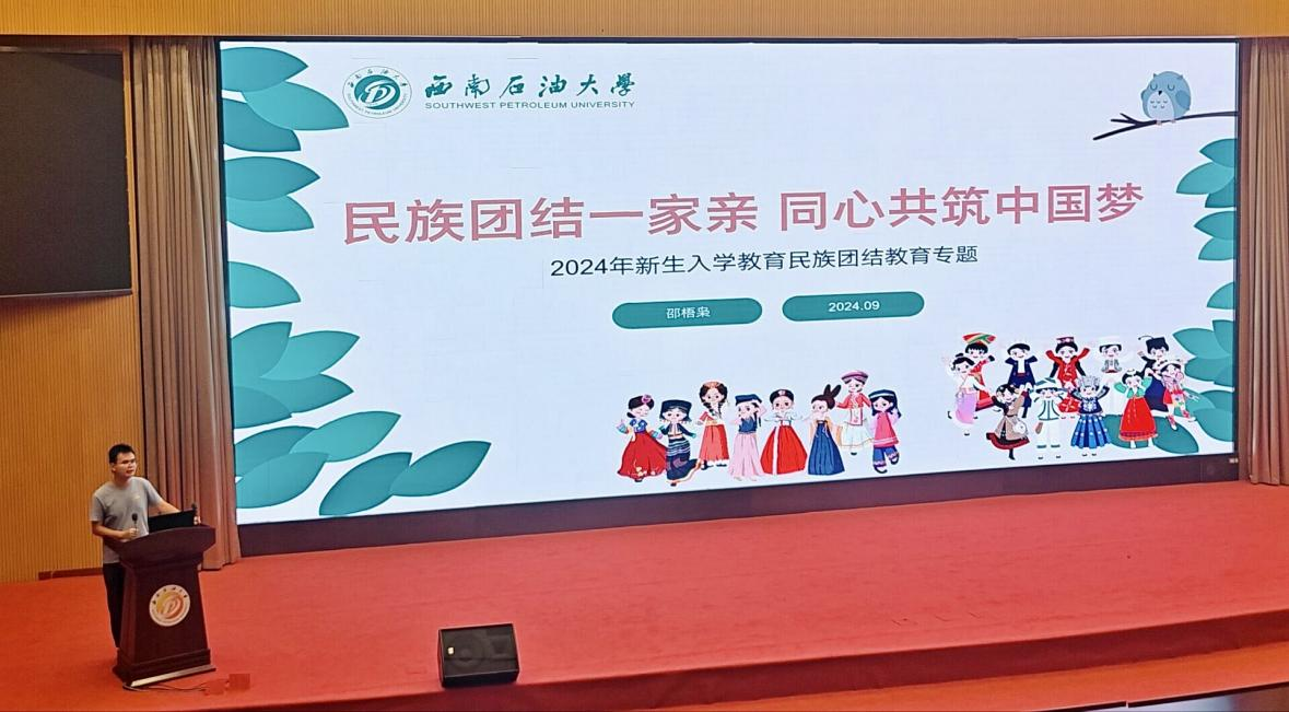 活动中,邵梧枭老师主要从感受民族风采、认识民族团结、维护民族团结三个方面进行讲述。邵老师提到中华民族一家亲,五十六个民族都各具特色,相互区别又相互包容,我们大学生在维护民族团结方面有着不可推卸的责任。邵老师结合自己的个人经历,配以生动的图片和视频,向我们展示了不同民族的特色风情;又从国家政策层面分析了各民族的资源禀赋,从而进一步阐释了民族平等的观念,让新生能够认识民族团结,推动民族团结。