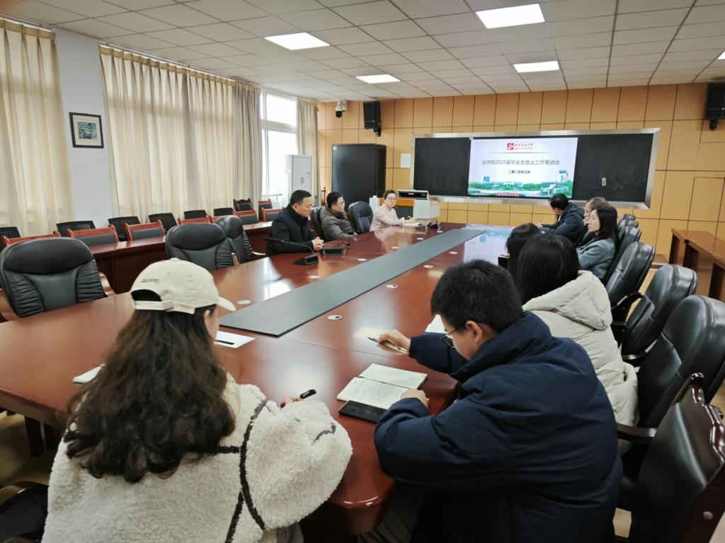 2025年3月5日15:00,法学院在博学楼A408召开2025届毕业生就业工作推进会,法学院党委书记张华春、院长傅晶晶、副院长周炎炎及学院全体辅导员参会,会议由党委副书记、纪委书记于百江主持。